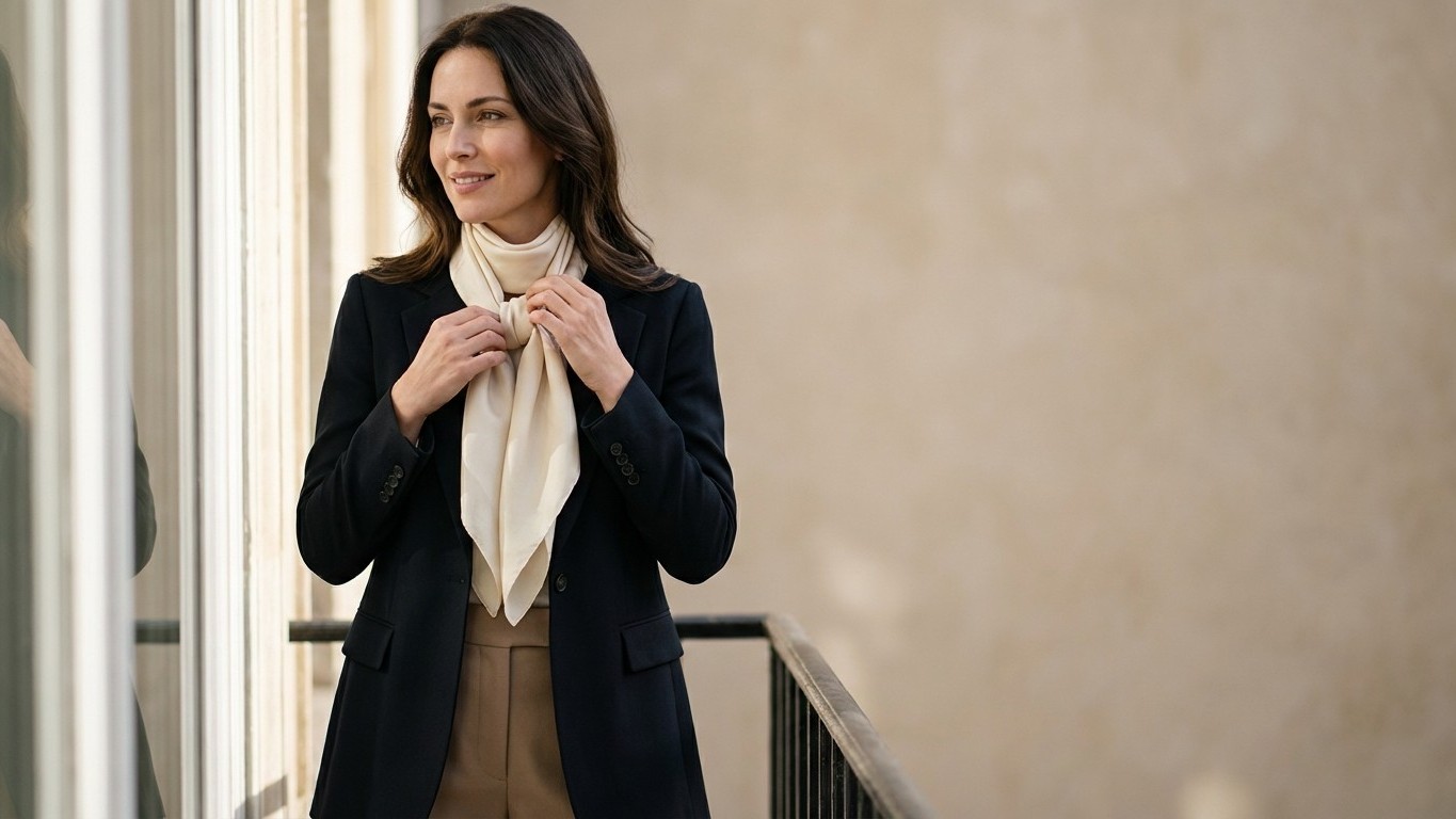 En cambio, cuando el cuello es más corto o ancho, su aproximación cambia radicalmente. Prefieren nudos más discretos y posiciones más altas, casi rozando la línea de la mandíbula. El pañuelo se convierte entonces en un elemento verticalizante, a menudo dejando caer las puntas de forma asimétrica para crear una ilusión de alargamiento. La maestría está en conseguir que parezca absolutamente natural, como si hubieran nacido llevando esa pieza de seda.